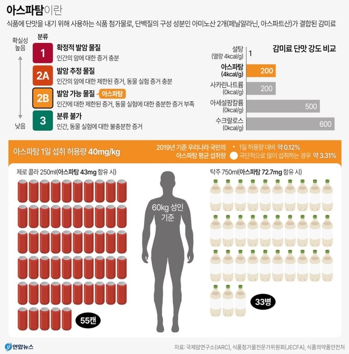 일일 허용 섭취량: WHO 산하 전문기관인 국제식량농업기구/세계보건기구 합동 식품첨가물전문가위원회(JECFA)는 아스파탐의 일일섭취허용량을 체중 1㎏당 40㎎으로 유지하기로 결정했습니다. 이는 성인 기준으로 제로콜라 250ml(아스파탐 43mg 함유)를 하루에 55캔 이상 마시지 않는 이상 안전한 수준입니다.