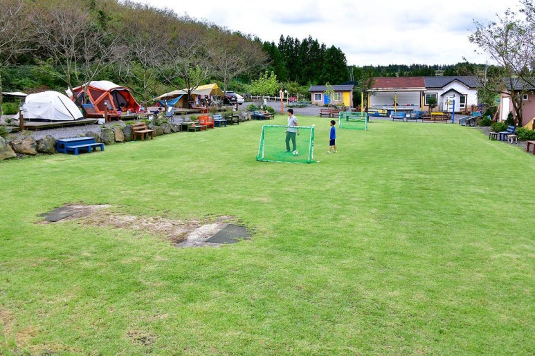 골체오름캠핑은 한 가운데에 잔디 운동장이 있어 아이들이 마음껏 뛰어놀기에 좋은 가족캠핑장이다. 축구공, 배드민턴, 캐치볼, 줄넘기, 훌라후프 등을 무료로 대여해 주고 있어 편하게 놀 수 있는 곳이다. 아이들이 안전하게 노는지 엄마들은 텐트 안에서도 지켜볼 수 있어 좋다.