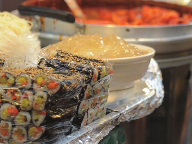 단무지와 시금치, 당근이 전부인 꼬마김밥을 마약처럼 계속 생각이 나 ‘마약김밥’이란다. 즉석에서 부쳐내는 녹두전은 어떤지. 시식용 조각도 큼직하지만 그것으론 성에 차지 않아 사먹게 된다. 두터운 순대와 쫀득한 떡볶이도 양보할 수 없다. 육회 골목과 횟집이 즐비해 애주가들의 마음을 훔친다. 각종 나물을 넣어 비빈 양푼이 비빔밥과 멸치 육수로 시원하게 맛을 낸 잔치