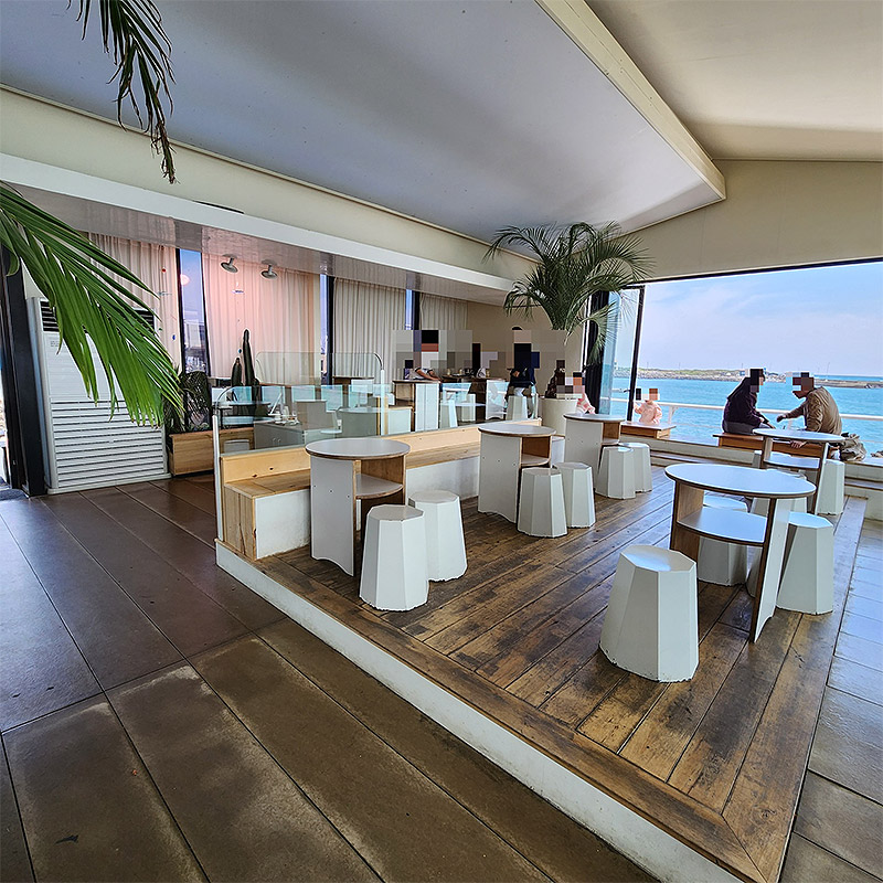 블랑로쉐는 카페에 앉아 바다를 바라볼 수 있는 곳에 위치하고 있습니다. 우도에 위치한 곳으로 전면 통유리는 물론 바다를 향해 나 있는 좌석이 있어 섬에 온 느낌을 더 잘 낼 수 있는 공간입니다.