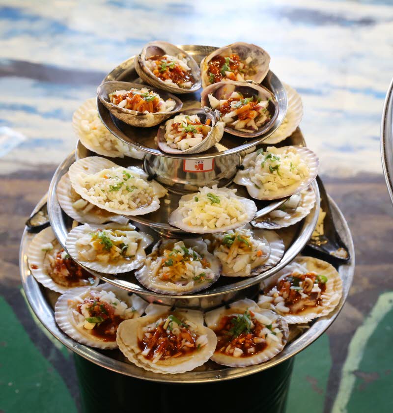 대표 메뉴는 조개를 쌓아 올린 쟁반이 분수를 연상시키는 ‘조개구이’입니다. 양념, 카레, 치즈를 얹은 가리비부터, 조개 떡볶이, 키조개, 꼬막의 푸짐한 구성으로 제공됩니다. 남은 떡볶이 양념에 김 가루와 밥을 넣고 볶아낸 볶음밥도 별미입니다.