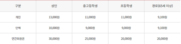 운영시간은 오전 9시부터 오후 6시까지이며, 입장 마감은 오후 5시인데요. 휴무일은 매주 월요일이라고 합니다. 입장료는 다음과 같습니다.