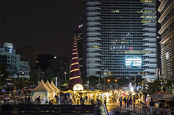 시장 천막의 이미지를 막구조로 적용하여 동대문 재래시장의 역사성 및 향수를 연출하였다.