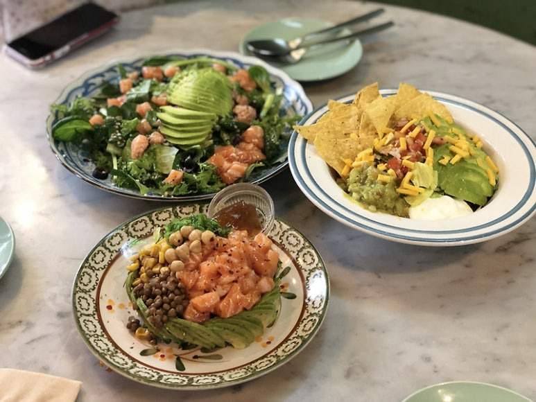 이곳의 대표 메뉴인 ‘아보카도 연어 포케’는 밥 위에 연어, 콩, 해초, 옥수수를 올린 후 얇게 썬 아보카도로 아름답게 둘러싸여 있습니다. 포케와 함께 제공되는 간장 젤리를 조금씩 얹어 곁들여 먹으면 더욱 풍미가 살아납니다.