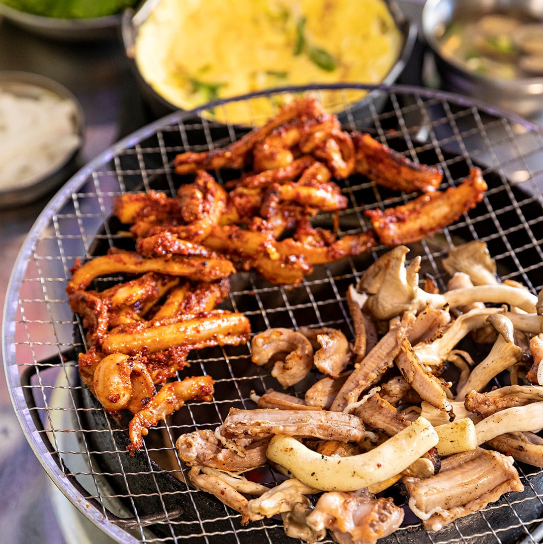 대표 메뉴인 ‘꼼장어’는 매콤한 양념장에 버무린 곰장어를 연탄불로 초벌구이하여 제공됩니다. 청양고추가루와 배, 키위, 매실청으로 만든 양념장을 사용해 깔끔하게 매운맛을 느낄 수 있으며, 담백한 맛을 살린 소금구이도 많은 사랑을 받고 있습니다.