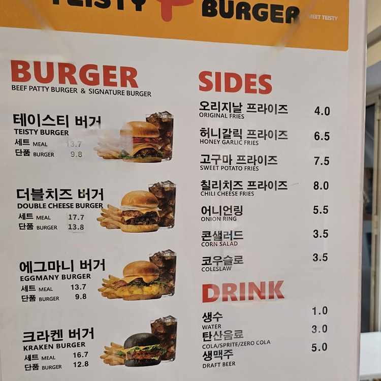 가수 테이가 운영하는 버거집 ‘테이스티 버거’. 이곳의 주문은 키오스크를 통해 이뤄집니다. 대표 메뉴는 오징어 먹물 번, 오징어 패티, 타르타르 소스를 곁들인 ‘크라켄버거’. 바삭하고 탱글탱글한 오징어 패티가 매력적입니다. 버거 번을 꾹 눌러 달걀노른자를 터뜨려 먹는 방법을 추천하며 버거를 한층 더 촉촉하게 즐길 수 있습니다.